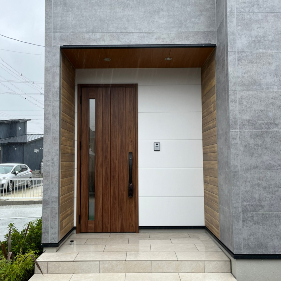 玄関先は木目調の外壁サイディングをアクセントとして採用しました♪