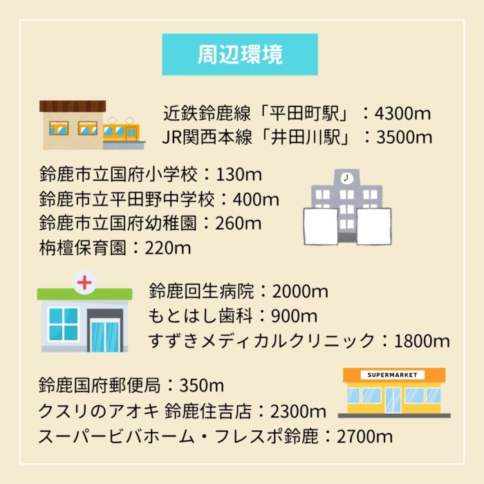 交通は、近鉄鈴鹿線「平田町駅」やJR関西本線「井田川駅」が車で15分圏内、亀山や津方面へのアクセスも良好です!